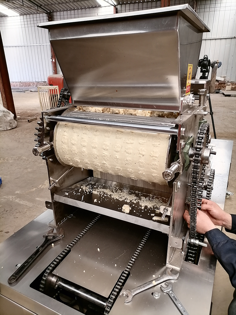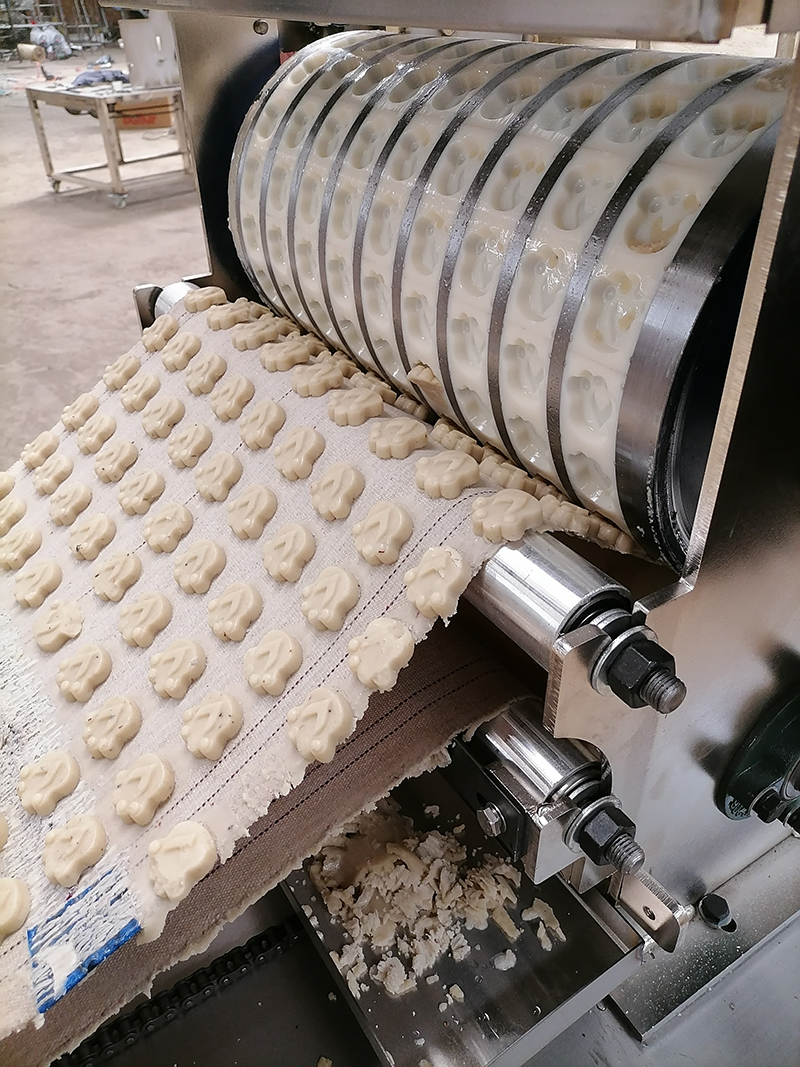 *This machine is for crispness biscuit and walnut biscuit roll printing and pressing to form biscuit shape. Feed the mixed raw material into the feeding hopper, the machine will produce different shapes and grams of biscuits.